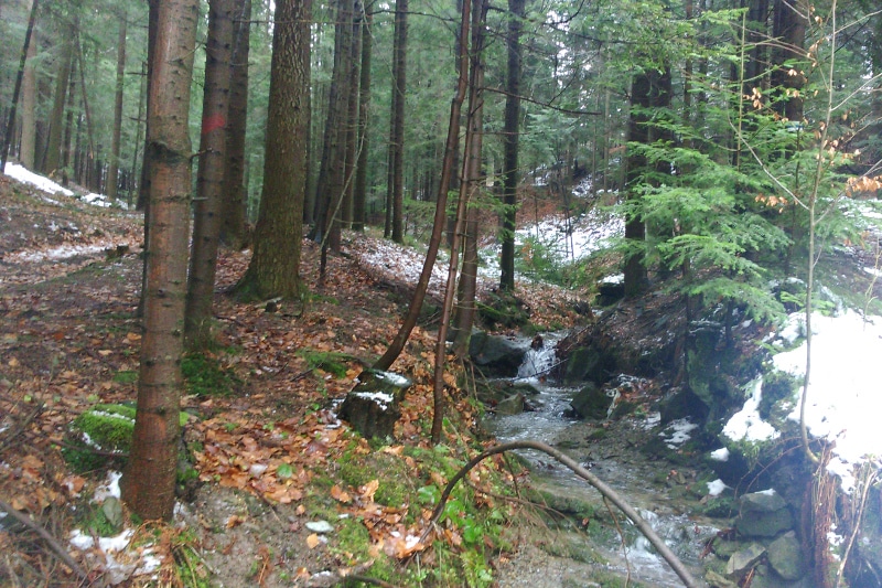 Pojechaliśmy. Zaplanowałam trasę z Bieńkówki na Koskową Górę (866 mnpm). Polecano nam ją ze względu na piękne widoki na szczycie, łatwe wejście i generalnie trasę fajną dla dzieci. Tam gdzie nie było śniegu leżały tony błota a drogą płynęła woda.