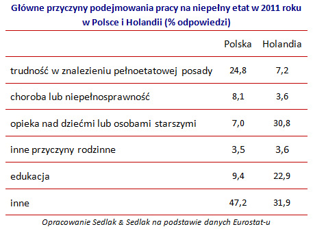 Jak pokazuje opracowanie firmy Sedlak & Sedlak (partnera Mamo Pracuj), na podstawie danych Eurostat-u za I kwartał 2012 roku. Zaledwie 7,4% Polaków pracuje w niepełnym wymiarze godzin. Porównywalna sytuacja jest w innych krajach Europy Środkowej – na Węgrzech, w Czechach, na Słowacji, a także w Grecji.